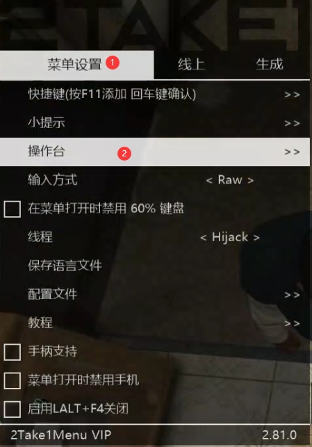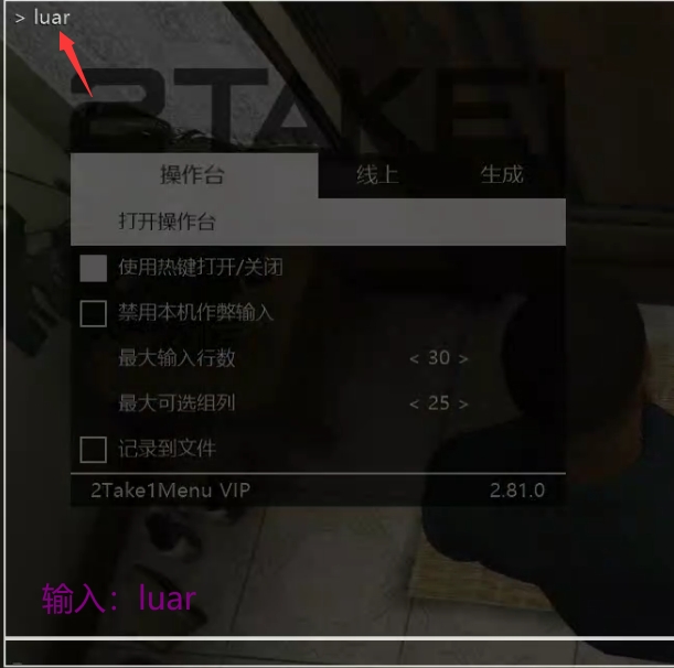 注入2Take1成功后并进入线上模式后,打开菜单-