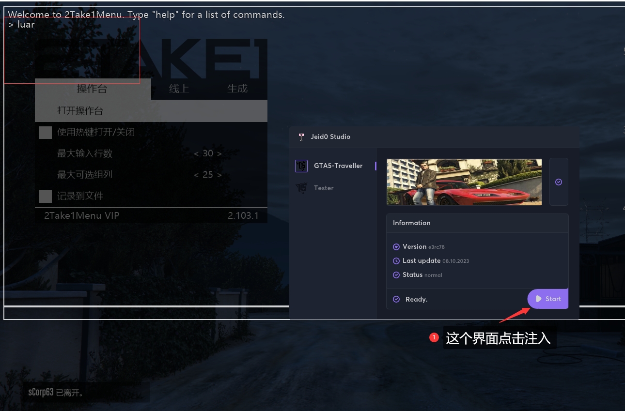 如果注入都没有问题,但是在点击登录的那一下报错的话请删除 %appdata%\PopstarDevs\2Take1Menu\scripts\TravellerLuaScript 这一整个文件夹